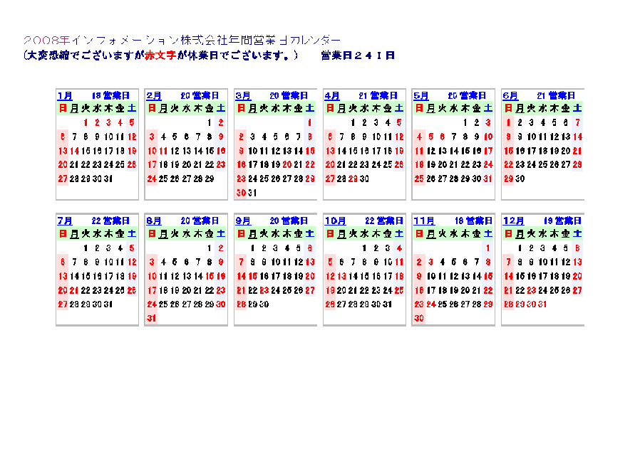 ●インフォメーション株式会社年間営業日カレンダー